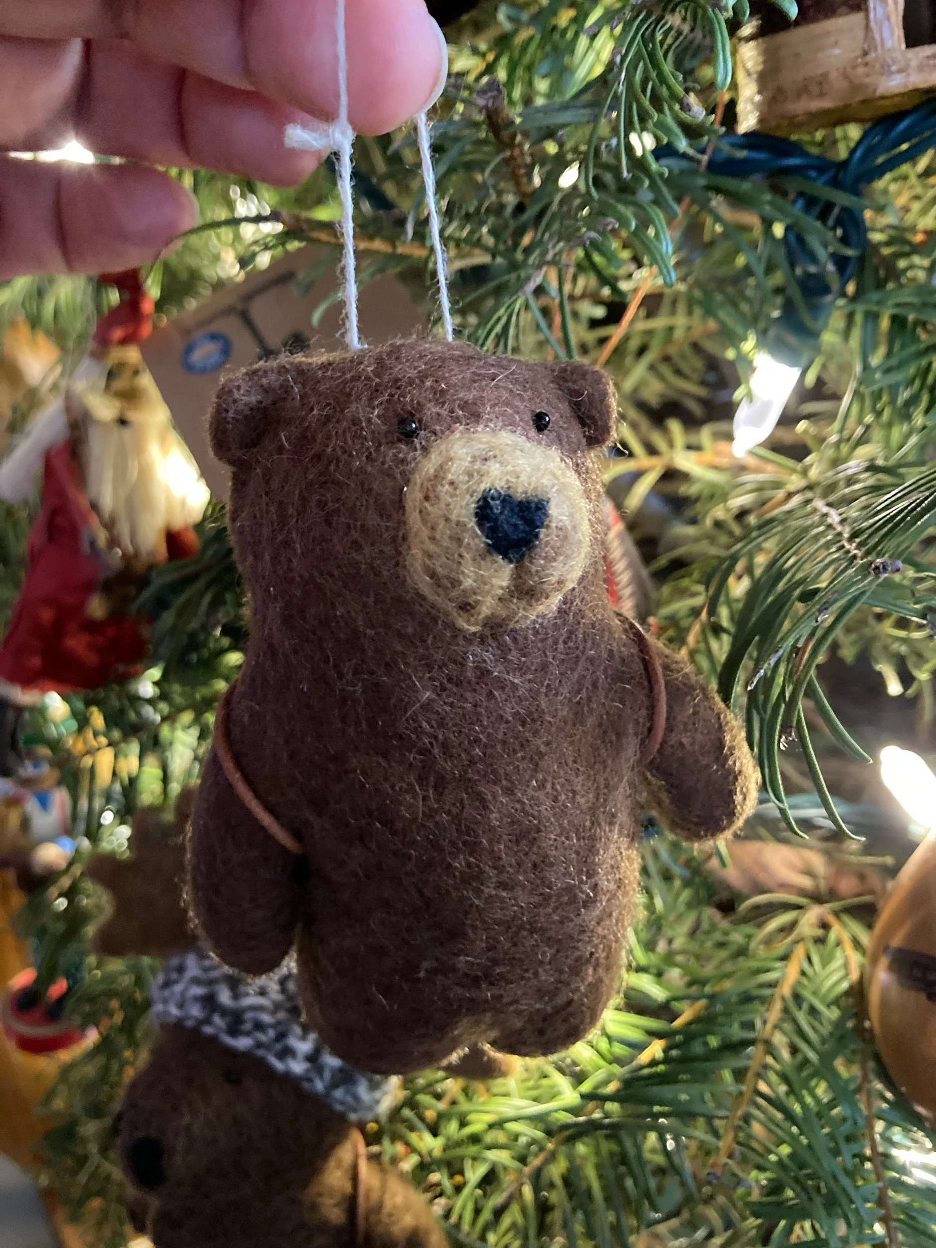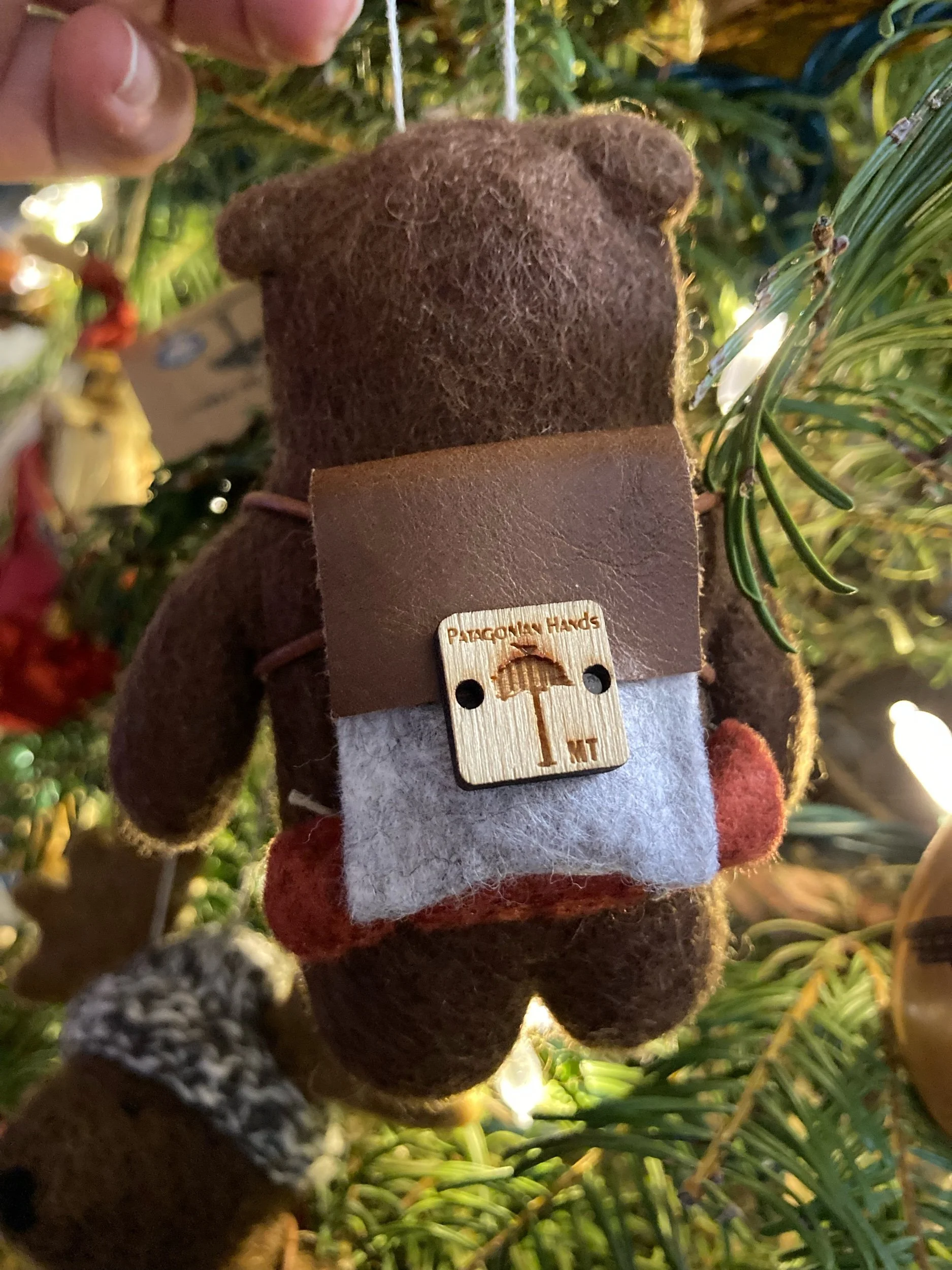 Needle felted ornament with a backpack made with Merino wool and leather.