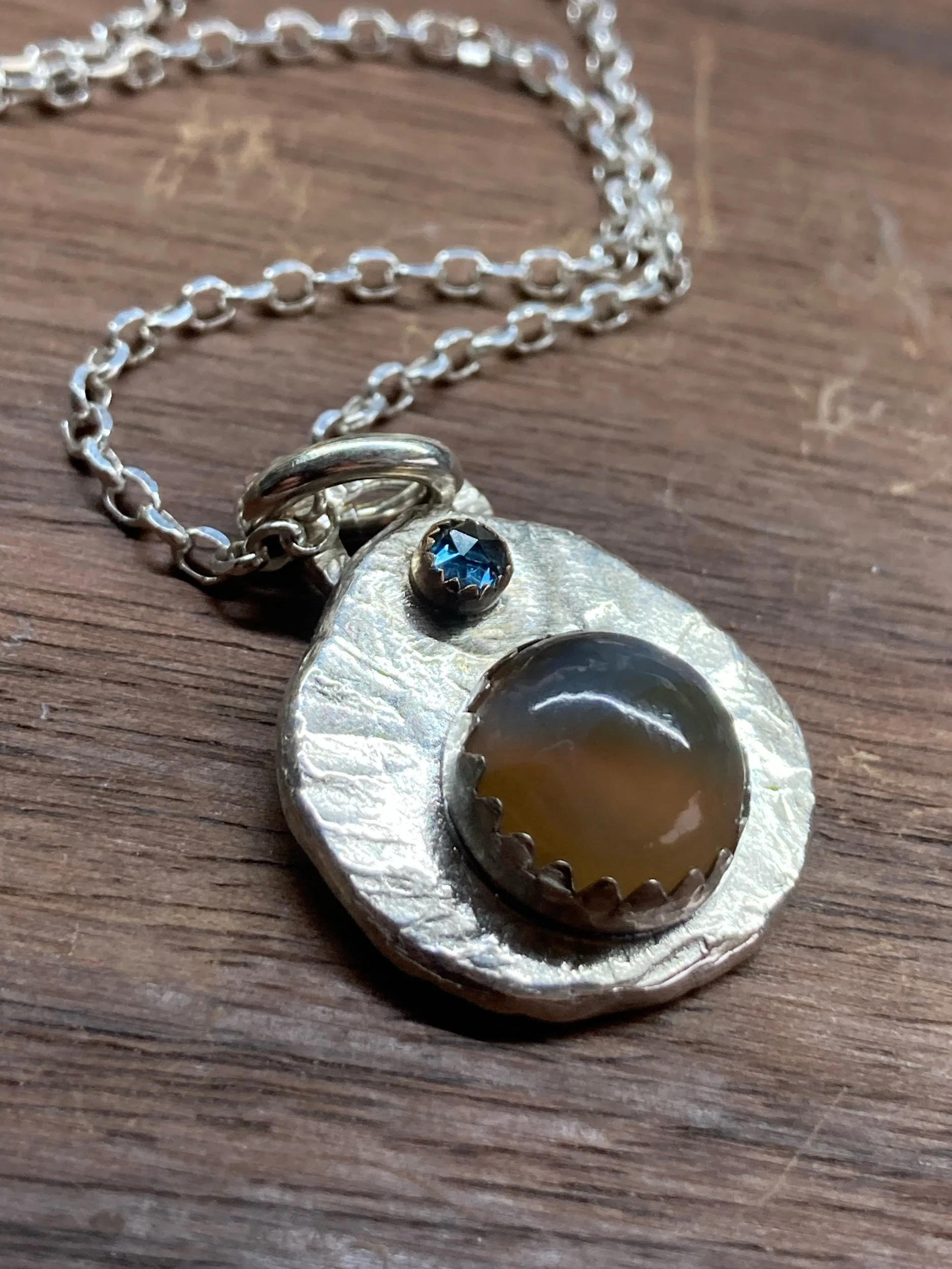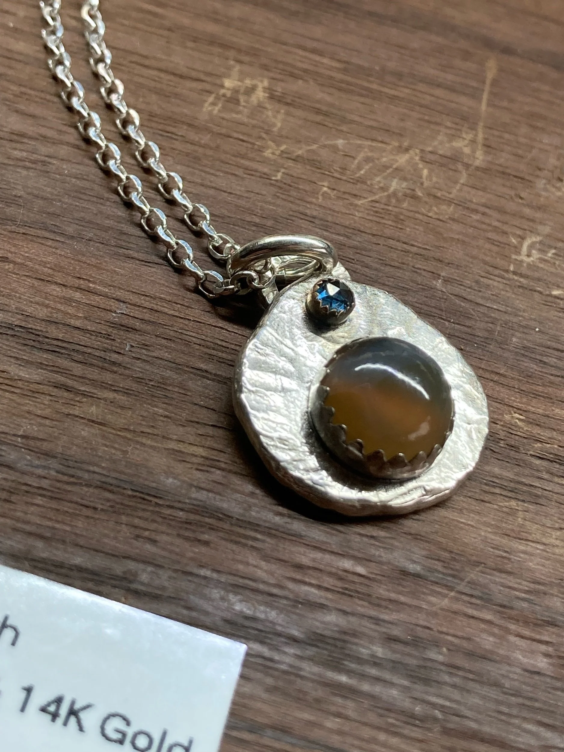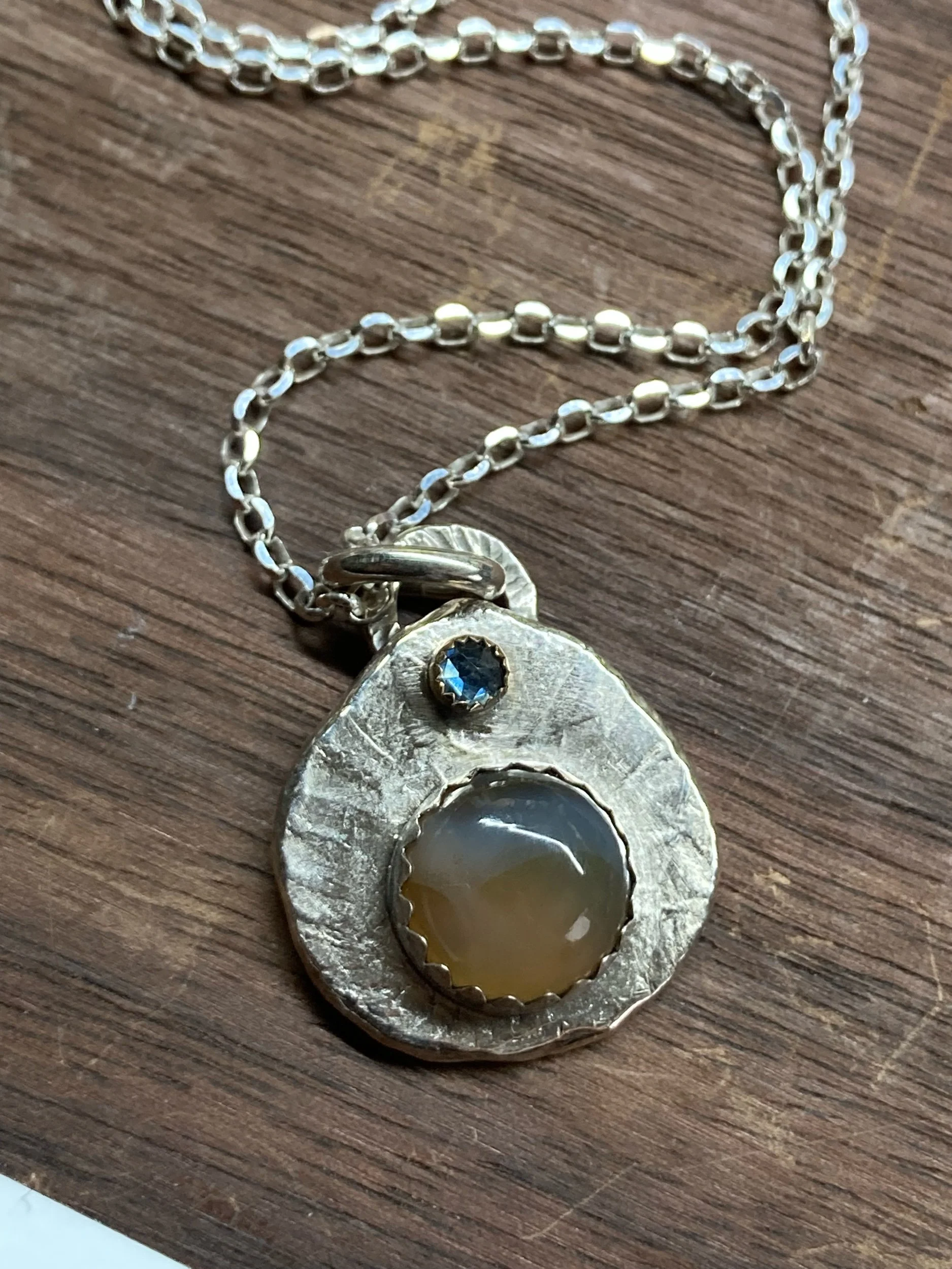 This recycled Fine Silver necklace features a Montana Agate from the Yellowstone River and a Montana Sapphire, plus a 14K Gold bezel and an 18” Sterling Silver chain.